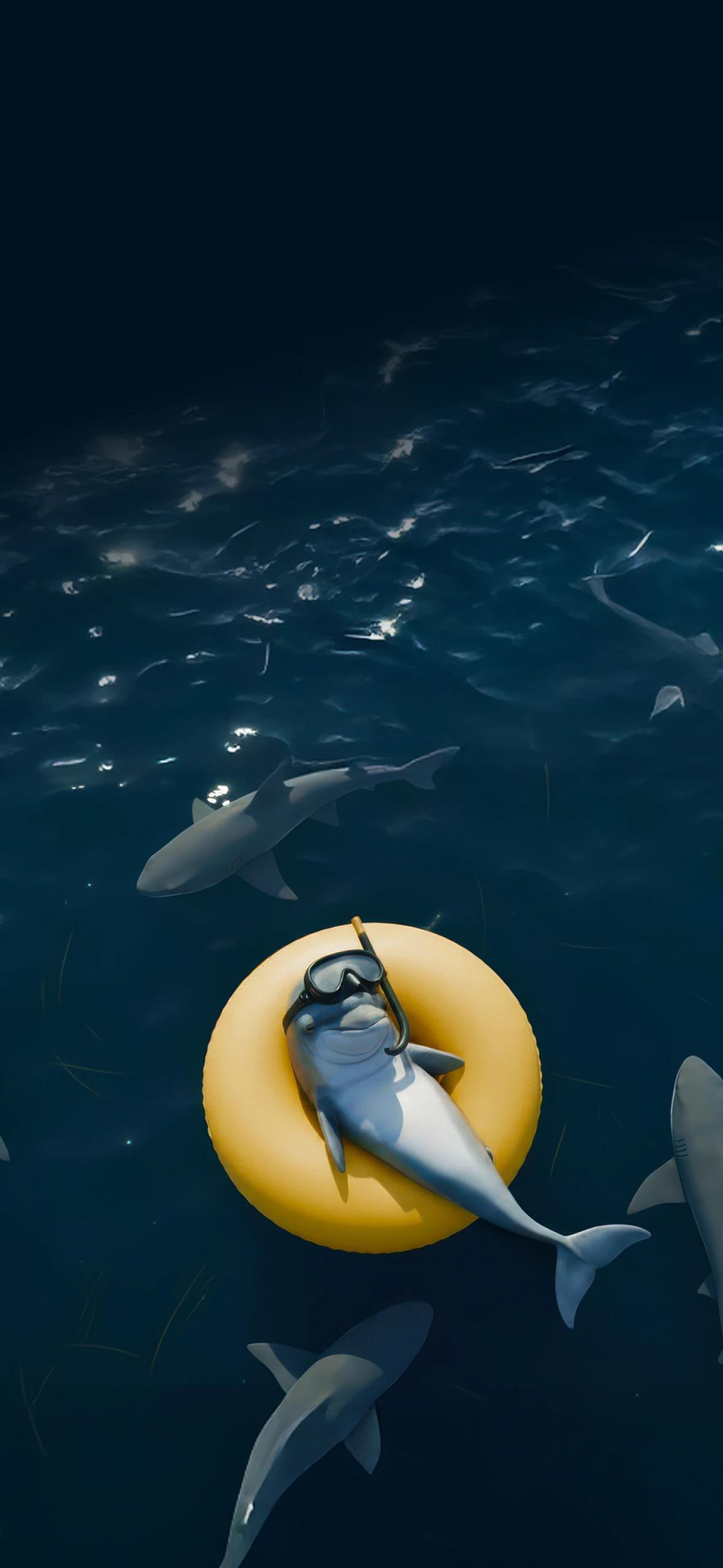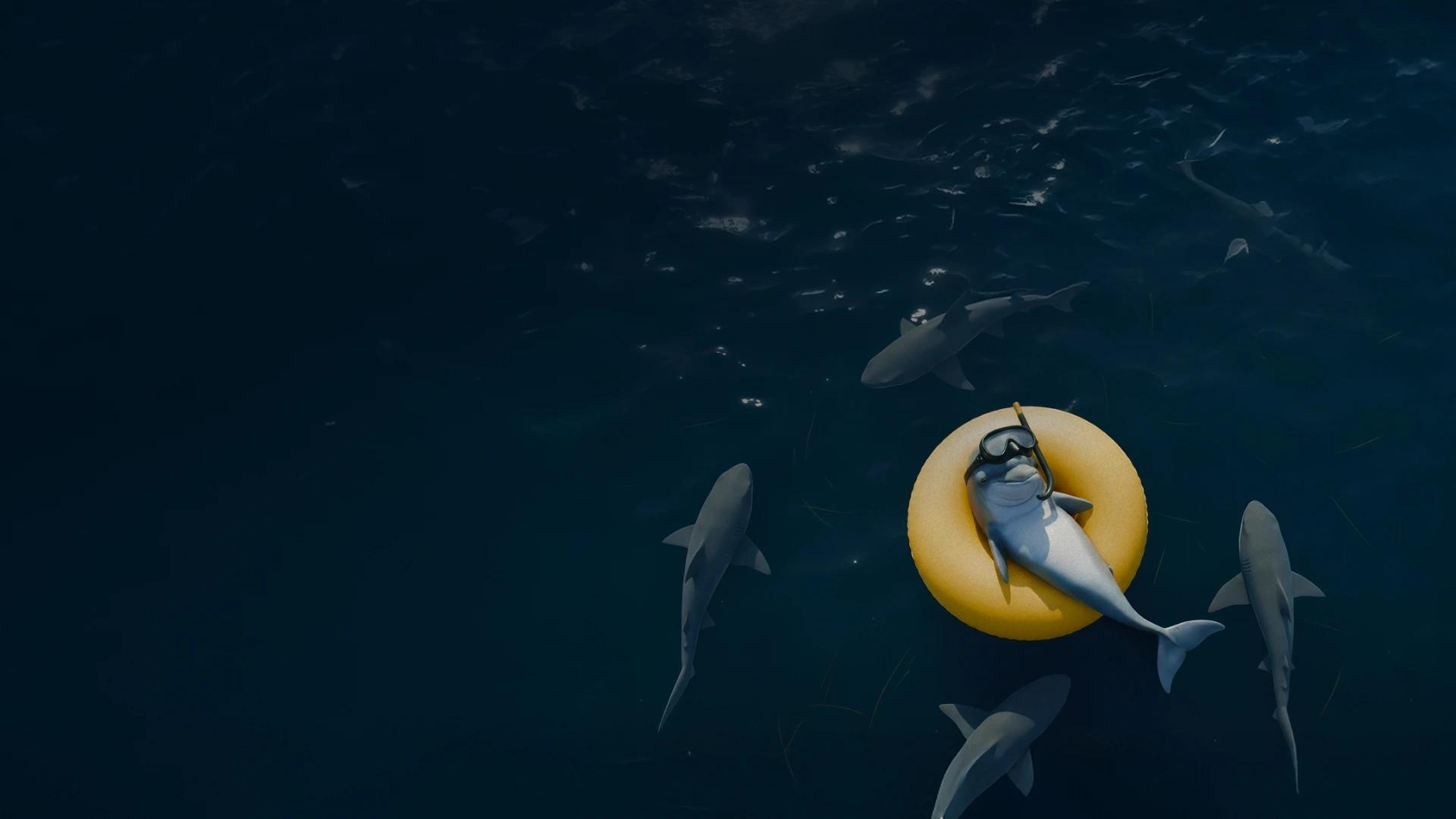 Anyfins maskot, Delfi, sitter i en badring på havsbottenAnyfins maskot, Delfi, sitter i en badring på havsbotten