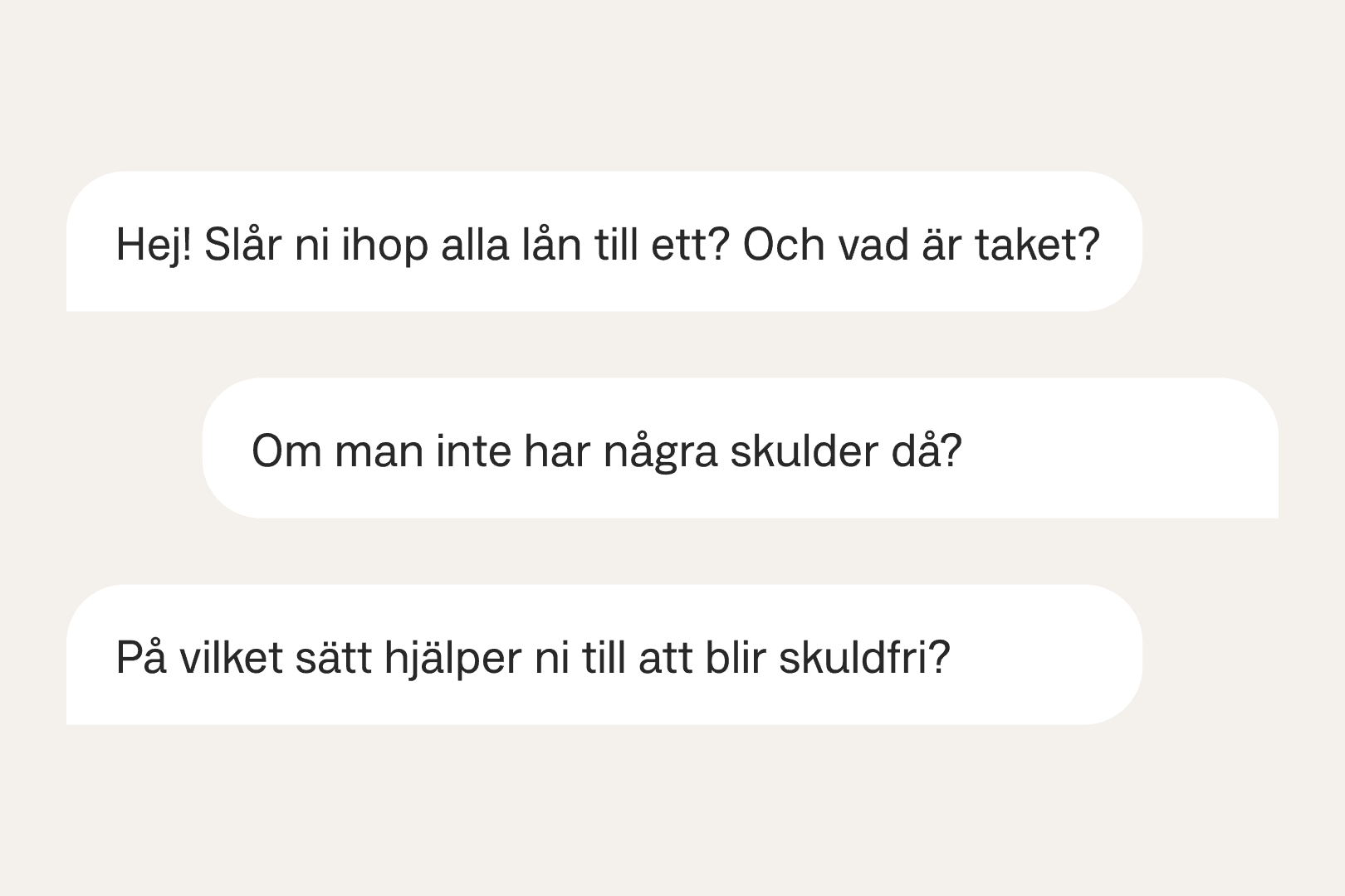 Nej vi slår inte ihop flera lån till ett. Vi gör en individuell bedömning av varje lån och sedan sätts en ränta på varje lån baserad på detta. Flera olika lån kan alltså få olika räntor. Däremot hamnar alla lån på en och samma faktura. Det ger dig bättre överblick på din skuld.